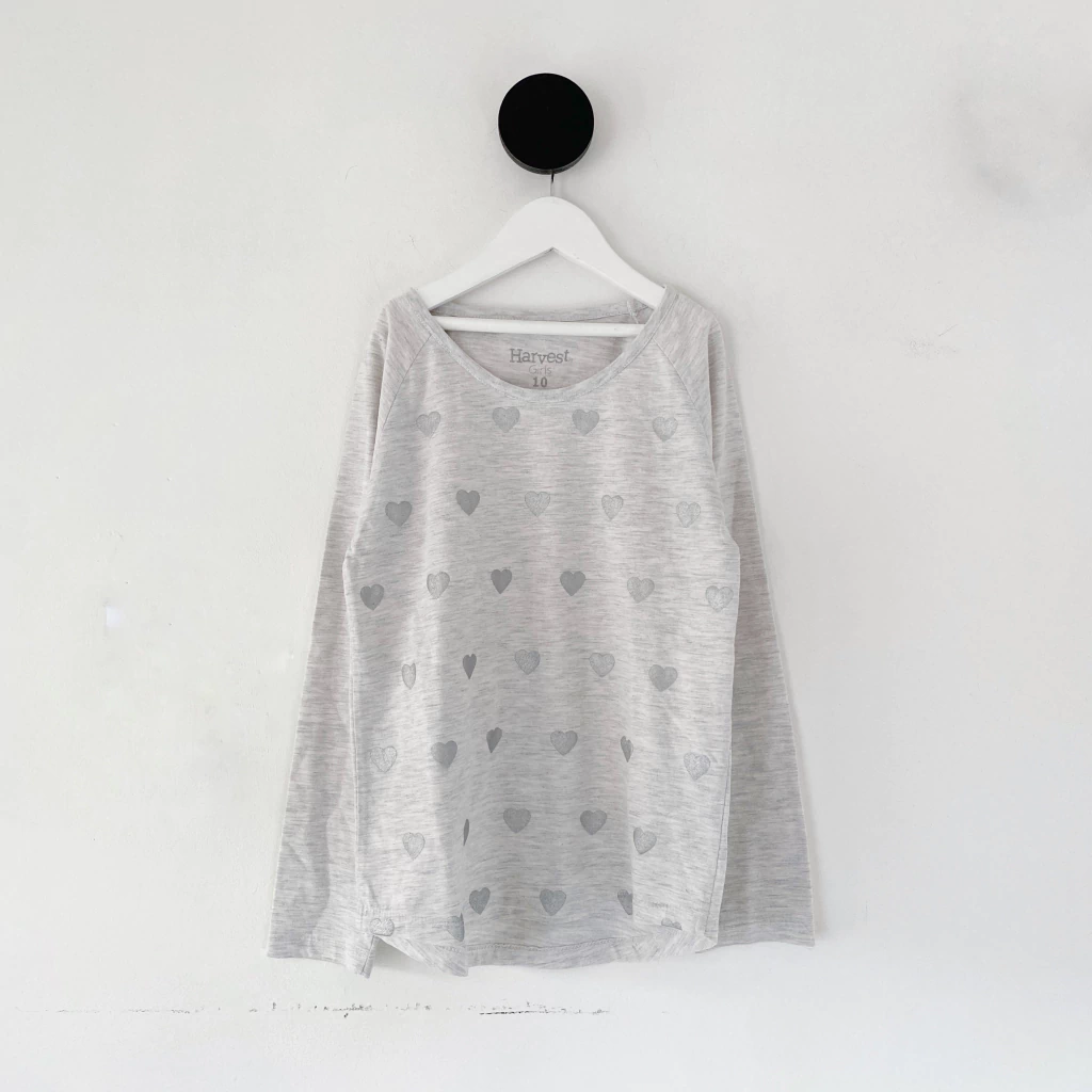 Esta remera de HARVEST es pura ternura con onda. De manga larga ranglan y confeccionada en algodón gris suave, tiene un detalle que enamora: mini corazones plateados estampados por toda la prenda. Es cómoda, liviana y súper versátil para usar con jeans, calzas o joggers. Está en estado muy bueno, perfecta para seguir rodando con estilo y dulzura ♻️.