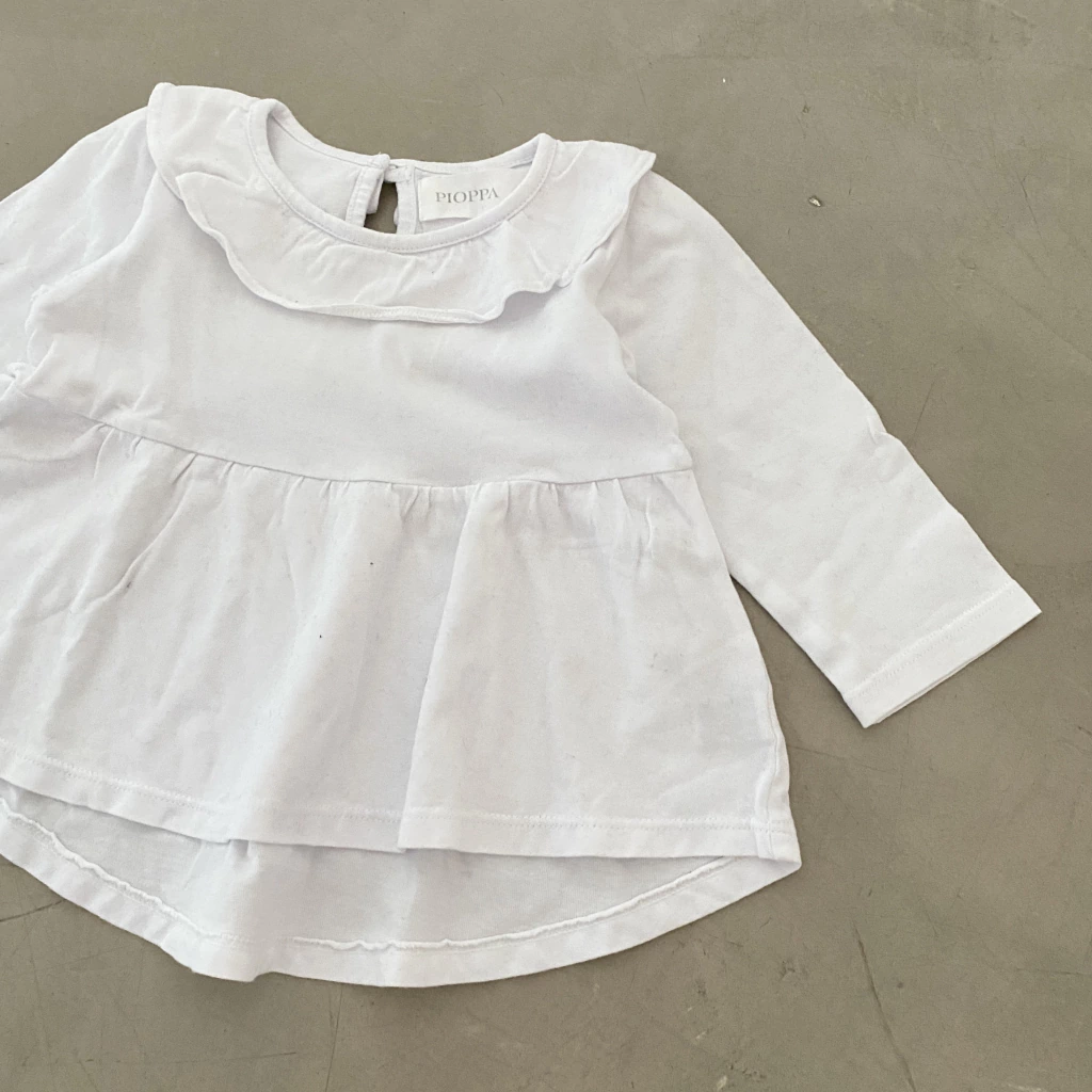 Remera de PIOPPA en talle 12 meses con corte tipo camisola, súper femenina y cómoda. Está hecha en jersey de algodón liviano y suave, ideal para entretiempo o para usar con una camperita liviana. Su total white le da un aire romántico y soñado. ✨🤍